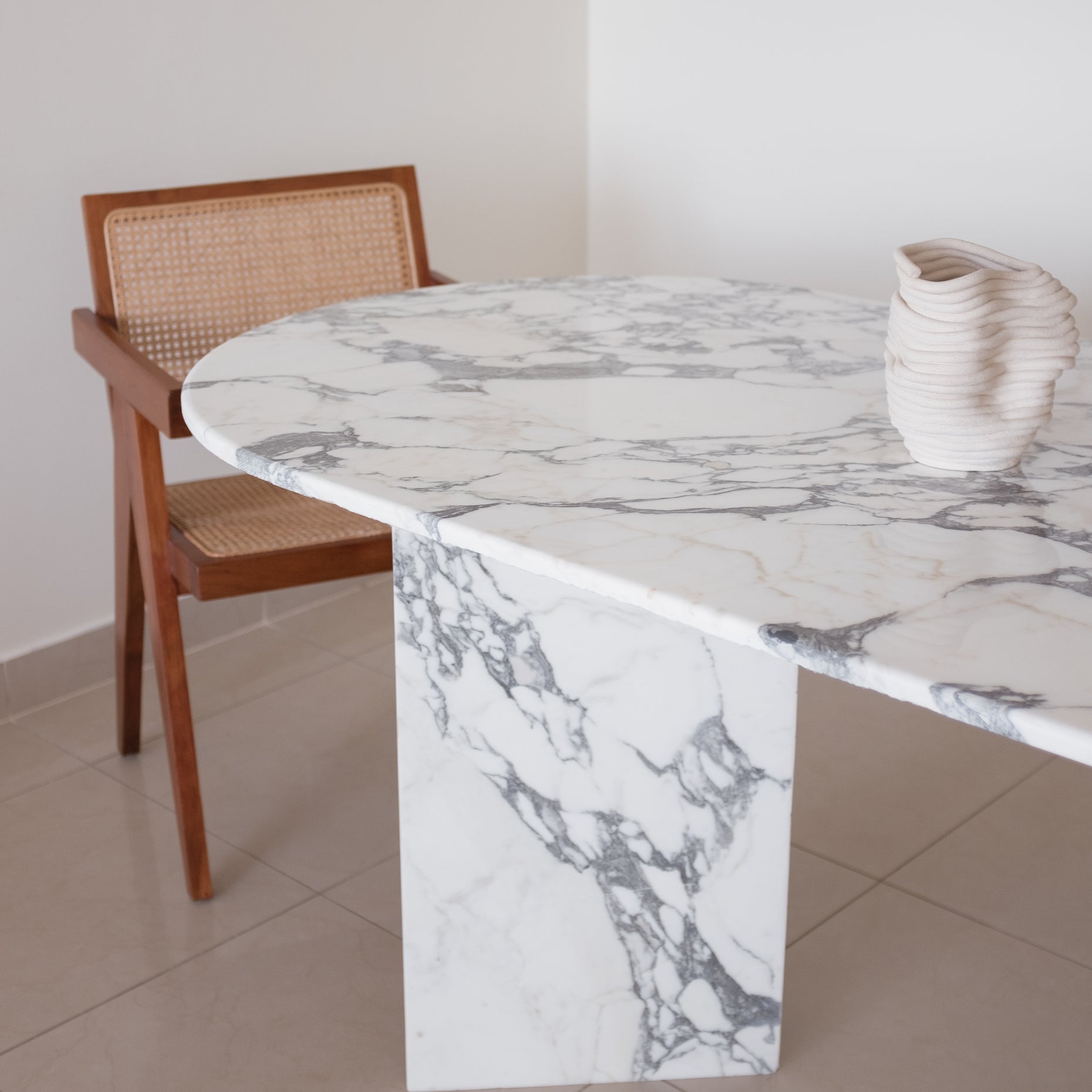 تحفة فنية تجمع بين الفخامة والتصميم العصري. سطحها البيضاوي مصنوع من رخام أرابيسكاتو الفاخر، ويستند على أرجل أنيقة على شكل حرف V، مما يخلق توازنًا رائعًا بين الكلاسيكية والرقي الحديث. مثالية للّقاءات الحميمة أو الولائم الفاخرة، وتُضفي لمسة من الجمال الخالد على أي مساحة طعام، لتكون النقطة المحورية في ديكور منزلك.