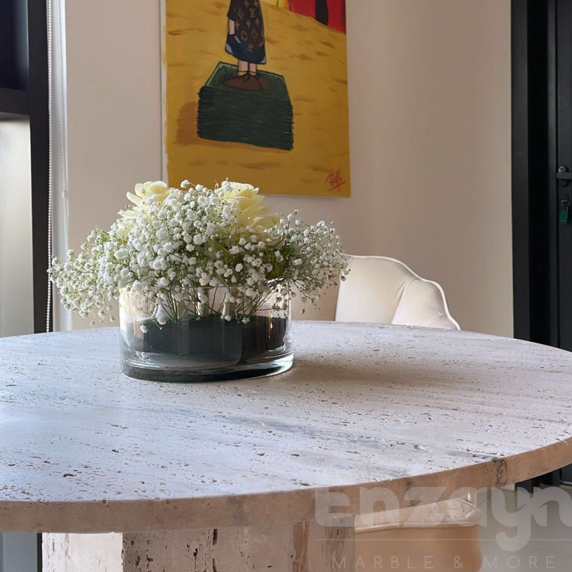 أضف لمسة من الرقي والأناقة إلى منزلك مع طاولة الطعام المصنوعة من حجر الترافرتين الطبيعي بلونه البيج الفاتح وخطوطه الهادئة. مصممة لتناسب المساحات الصغيرة مثل الشقق أو الزوايا أو المجالس، وتجمع بين الجمال العملي والحجم المثالي.